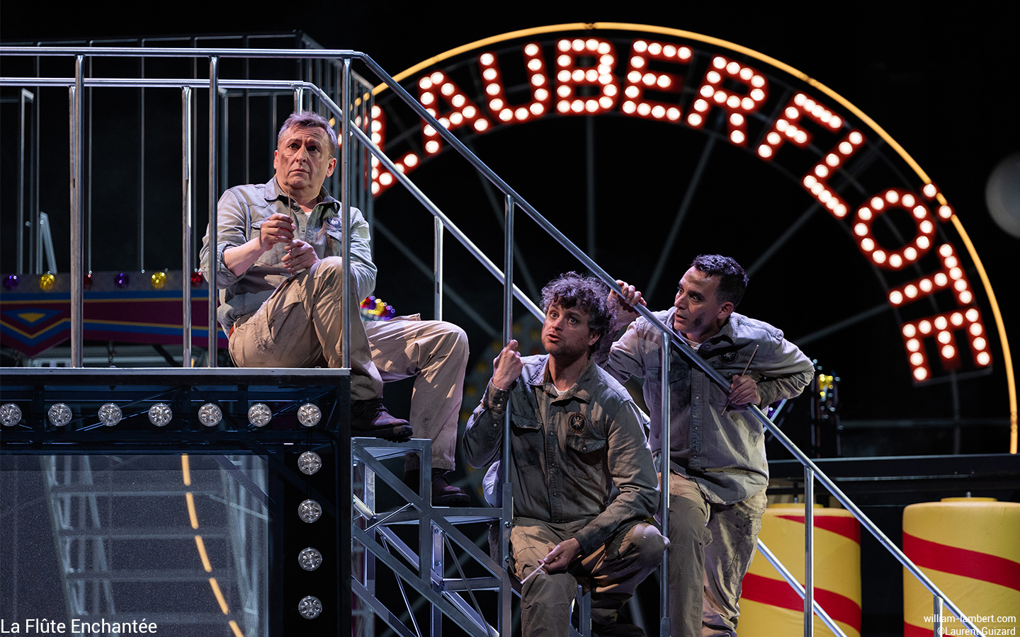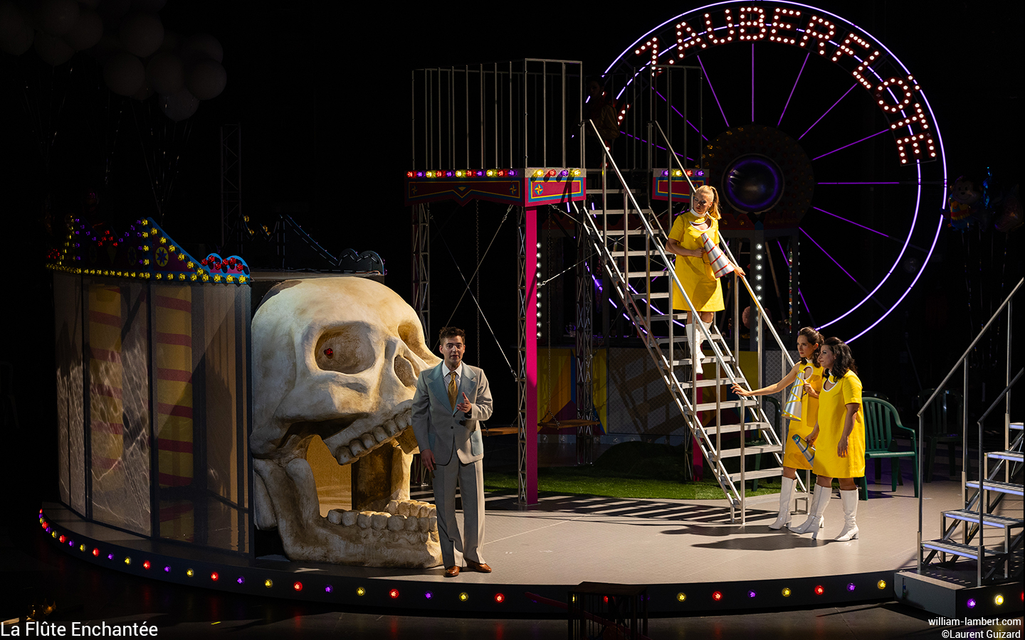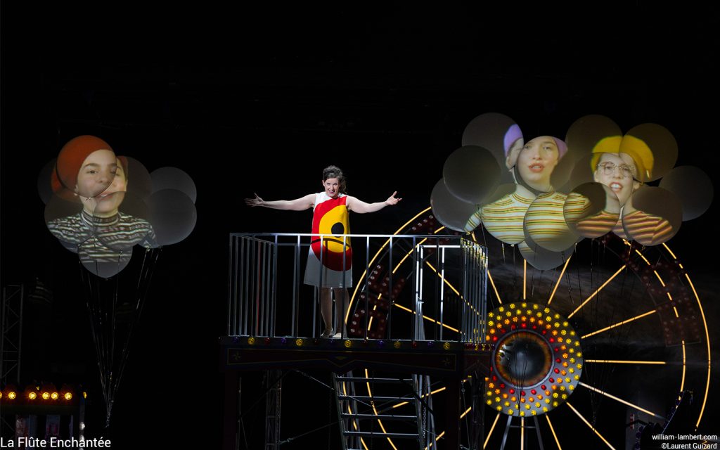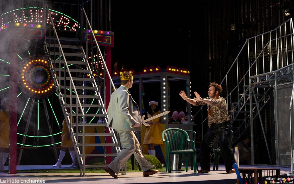 L’idée judicieuse est de situer l’action dans une fête foraine, représentée par sa grande roue illuminée arborant fièrement l’inscription « Die Zauberflöte ». Ce lieu éphémère d’expériences multisensorielles évoque l’enfance et propose une vision idéalisée de la société, centrée sur le plaisir et le divertissement.